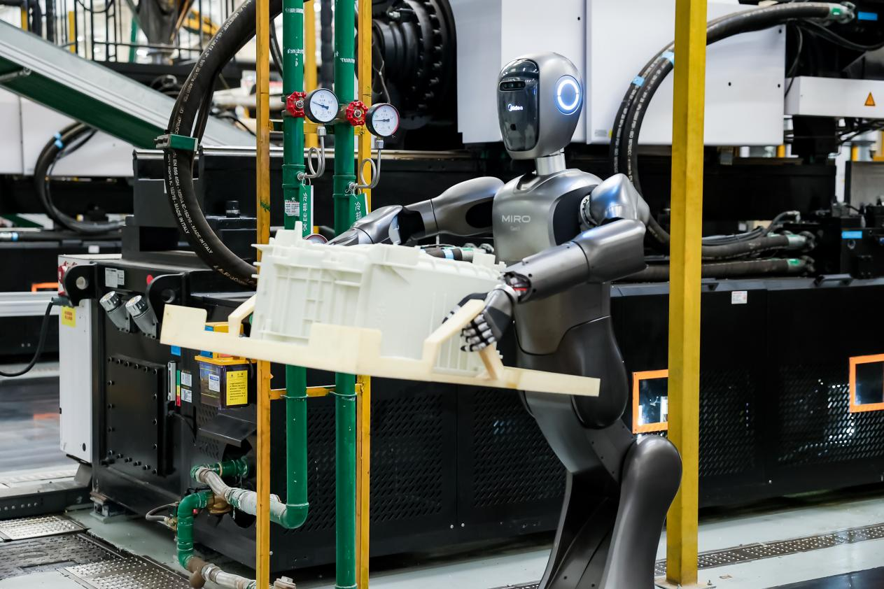 除了智能體工廠的探索,美的集團依托自有制造工廠與產(chǎn)線,實現(xiàn)人形機器人從實驗室到現(xiàn)場應(yīng)用的跨越。在注塑車間,人形機器人完成階段性調(diào)試,并與工廠業(yè)務(wù)系統(tǒng)打通,形成業(yè)務(wù)閉環(huán)。