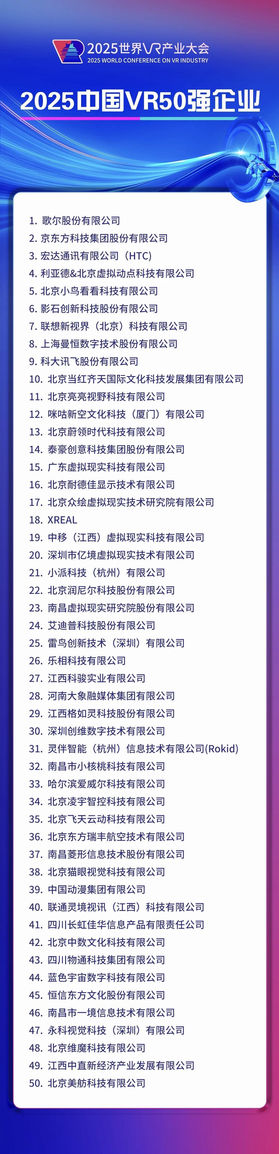 10月19日,“2025中國(guó)VR50強(qiáng)企業(yè)”名單正式發(fā)布,這是“中國(guó)VR50強(qiáng)企業(yè)”名單連續(xù)第七年發(fā)布。