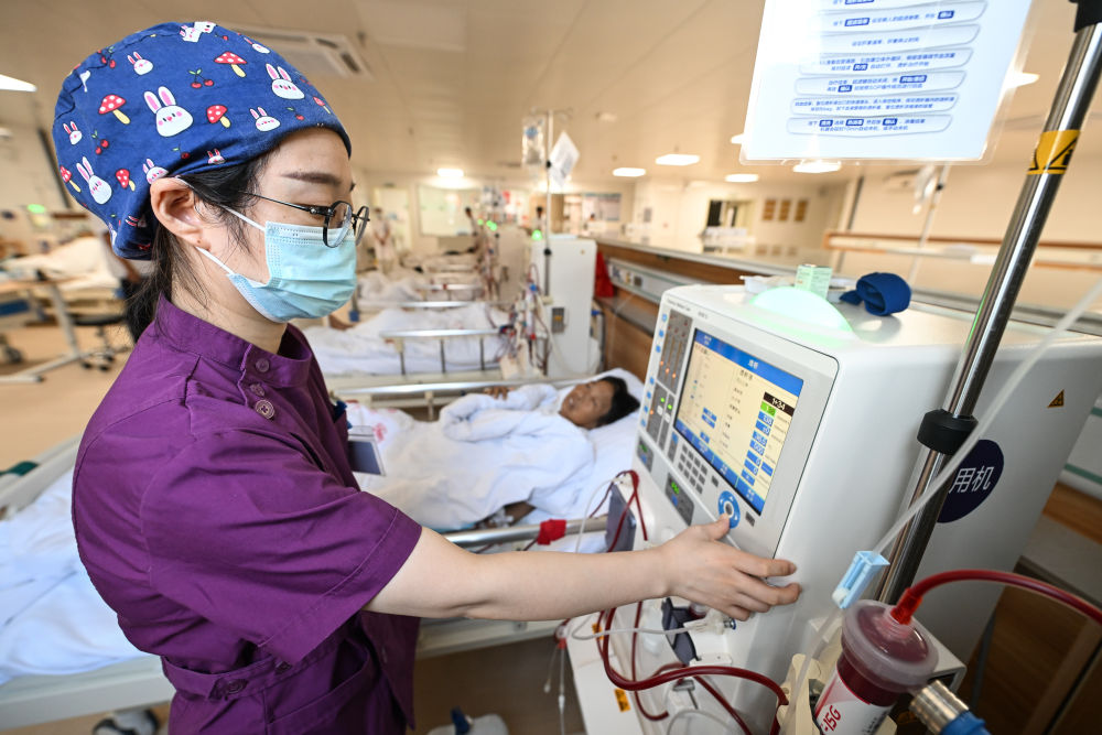 江蘇海安市曲塘中心衛(wèi)生院護士在血液透析中心操作設備(2024年7月31日攝)。海安加快優(yōu)質醫(yī)療資源下沉,對基層醫(yī)療機構管理、技術等方面進行幫扶。數據顯示,2023年海安市縣域內就診率為90.54%,基層醫(yī)療衛(wèi)生機構門急診占比為74.86%。新華社記者 季春鵬 攝