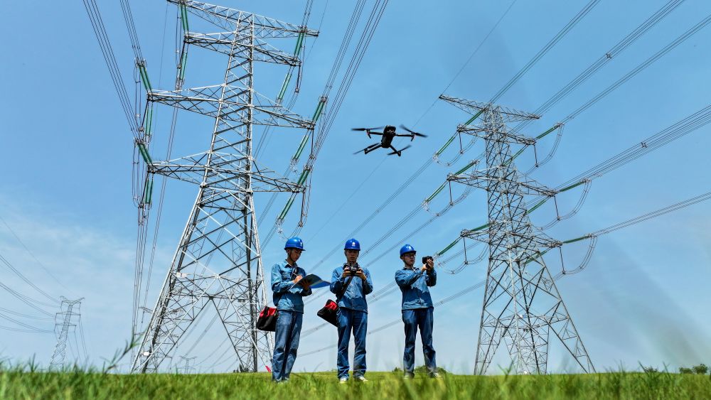 面對安徽、江蘇持續(xù)高溫,皖蘇兩省的電力工人聯合對省際聯絡線及相關配電設施進行檢修,并開展輸變電設施巡視檢查。這是在安徽省滁州市南譙區(qū),電力工人運用無人機對500千伏輸電線路進行巡視檢查(2024年8月9日攝)。新華社記者 曹力 攝