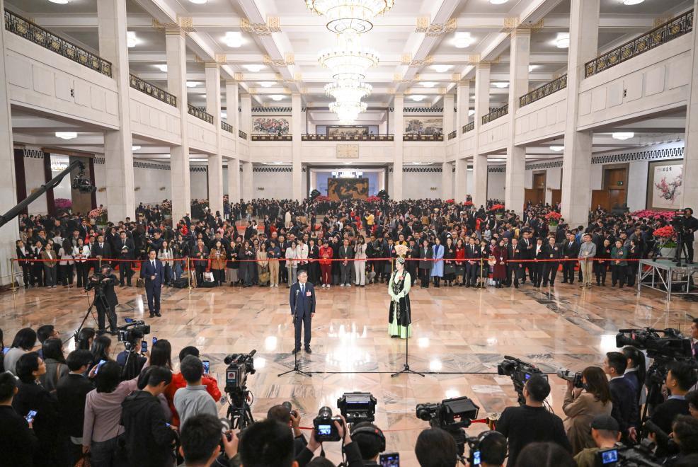 閉幕會前,人民大會堂中央大廳北側(cè),第三場“代表通道”集體采訪活動正在進行。