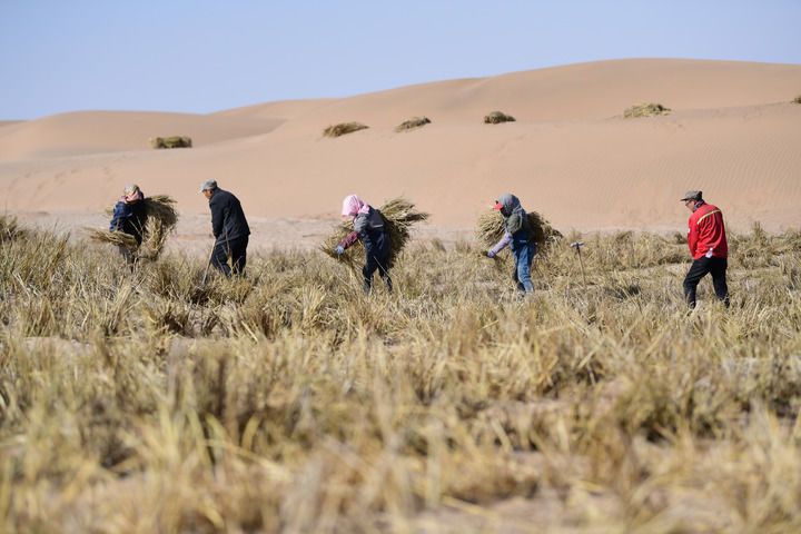 2025年2月28日,在巴丹吉林和騰格里兩大沙漠交匯處的阿拉善九棵樹項目區(qū),治沙工人用稻草在沙漠中扎草方格。新華社發(fā)(康文魁攝)