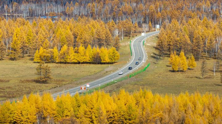 2025年9月29日,游客在內蒙古阿爾山國家森林公園駕車游玩(無人機照片)。新華社記者 貝赫 攝