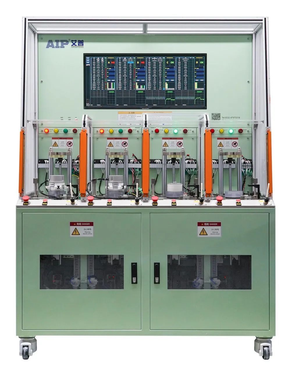 針對(duì)這一需求,艾普智能組建專業(yè)團(tuán)隊(duì),經(jīng)深入技術(shù)論證后,定制開發(fā)了一套四工位并行測(cè)試系統(tǒng)。該系統(tǒng)采用四工位同步測(cè)試設(shè)計(jì),能夠?qū)崿F(xiàn)高效并行測(cè)試,可一次性完成負(fù)載測(cè)試、霍爾特性、反電動(dòng)勢(shì)、轉(zhuǎn)速、轉(zhuǎn)向、缺相、交流耐壓、絕緣電阻等多項(xiàng)測(cè)試項(xiàng)目,大幅提升測(cè)試效率?;谀K化設(shè)計(jì),一套設(shè)備即可滿足直流電機(jī)與交流電機(jī)的測(cè)試需求,顯著降低客戶設(shè)備采購(gòu)與管理成本。此外,智能化管理方面,該設(shè)備支持與工廠MES系統(tǒng)對(duì)接,具備遠(yuǎn)程診斷和軟件升級(jí)功能,可實(shí)現(xiàn)測(cè)試數(shù)據(jù)的實(shí)時(shí)上傳與分析,快速響應(yīng)客戶需求。