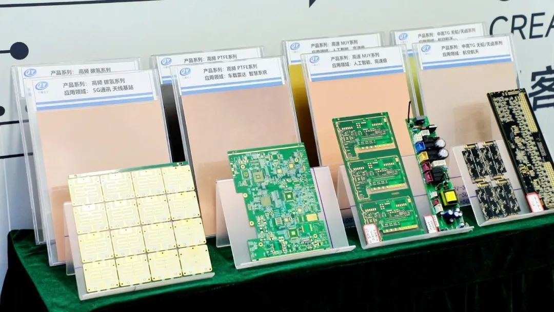 久耀電子科技(徐州)有限公司運(yùn)營副總監(jiān)彭海雷說:“這里展示的是我們覆銅板的幾類產(chǎn)品形態(tài)。其一,是通信類碳?xì)洚a(chǎn)品,主要用于通信信號(hào)傳輸;其二,是應(yīng)用于毫米波車載雷達(dá)領(lǐng)域的產(chǎn)品;其三,是在當(dāng)前熱門的AI算力算法領(lǐng)域應(yīng)用廣泛的產(chǎn)品類別;此外,還有適配航空航天等領(lǐng)域的產(chǎn)品,這類場景對板材的性能、穩(wěn)定性及質(zhì)量要求均較高。旁邊展示的是我們下游客戶的產(chǎn)品加工形態(tài)。我們會(huì)將全銅板形態(tài)的產(chǎn)品交付給客戶,客戶需自行蝕刻線路,去除多余部分以得到所需線路;后續(xù),客戶會(huì)進(jìn)行綠油涂覆、插件安裝等工序,最終將產(chǎn)品應(yīng)用于家用電器、機(jī)房高速設(shè)備等場景,服務(wù)于實(shí)際生活需求。”