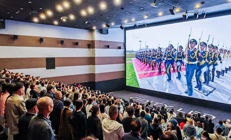 銀幕上的畫面一幀幀激蕩人心,看到受閱隊(duì)伍喊出響亮口號,有人低聲贊嘆著;看到新型裝備亮相,有人忍不住叫好。