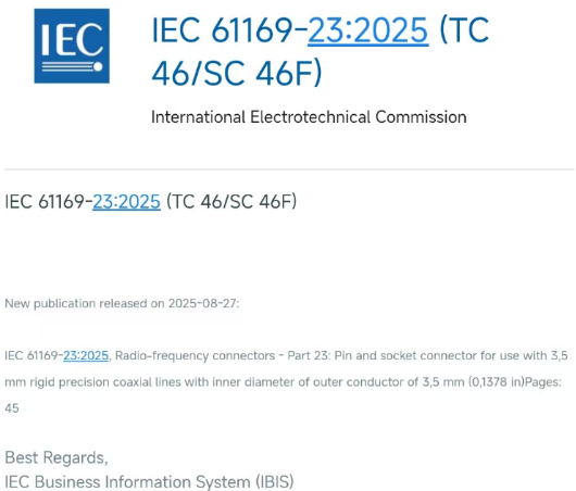 近日,從國際電工委員會(IEC)傳來令人振奮的消息:由蘇州華旃航天電器有限公司(以下簡稱“蘇州華旃”)主導制定的IEC61169-23:2025《射頻連接器第23部分:接3.5mm硬精密同軸線、外導體內(nèi)徑為3.5mm(0.1378in)的射頻同軸連接器》國際標準正式發(fā)布!這不僅是中國企業(yè)在國際射頻連接器領域話語權的重大突破,更是蘇州高新區(qū)以高標準助推高端裝備制造邁進的新里程碑。