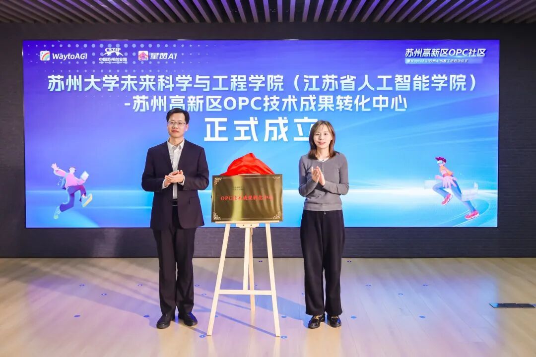 現(xiàn)場(chǎng),蘇州大學(xué)未來(lái)科學(xué)與工程學(xué)院(江蘇人工智能學(xué)院)-蘇州高新區(qū)OPC技術(shù)成果轉(zhuǎn)化中心成立,將以“人工智能+產(chǎn)業(yè)賦能”為核心導(dǎo)向,緊扣國(guó)家戰(zhàn)略重點(diǎn)方向,依托蘇州大學(xué)在人工智能、智能無(wú)人系統(tǒng)、人機(jī)智能交互等領(lǐng)域的高層次科研平臺(tái)與人才團(tuán)隊(duì),整合蘇州高新區(qū)在OPC生態(tài)培育、產(chǎn)業(yè)場(chǎng)景供給、市場(chǎng)資源集聚等方面的獨(dú)特優(yōu)勢(shì),構(gòu)建“高校源頭創(chuàng)新-園區(qū)場(chǎng)景驗(yàn)證-產(chǎn)業(yè)規(guī)模落地”的全鏈條轉(zhuǎn)化體系,助力OPC群體成長(zhǎng)為人工智能產(chǎn)業(yè)創(chuàng)新的重要生力軍。