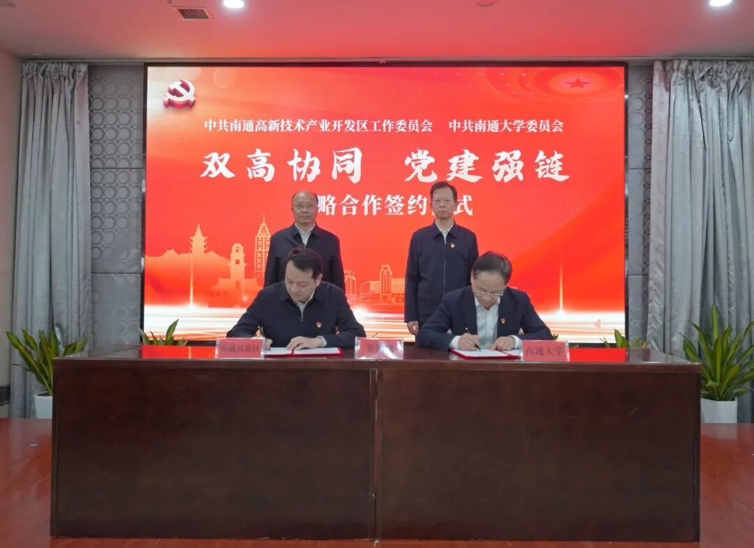 12月4日下午,南通高新區(qū)與南通大學聯(lián)合開展“雙高協(xié)同·黨建強鏈”活動?;顒又?,雙方簽訂了《“雙高協(xié)同·黨建強鏈”戰(zhàn)略合作協(xié)議》,并展開系列活動。南通市委常委、通州區(qū)委書記、南通高新區(qū)黨工委書記張建華出席活動并見簽,南通大學黨委書記楊宇民致辭,通州區(qū)委副書記、南通高新區(qū)黨工委常務副書記吳冰冰參加活動并為聯(lián)合攻堅黨小組授牌。