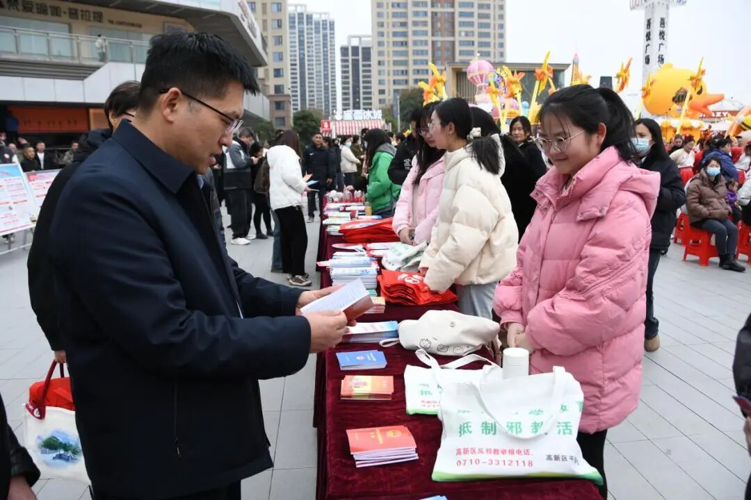 靜態(tài)宣傳中,工作人員通過法律咨詢臺、宣傳展板、發(fā)放普法資料等形式,普及憲法核心要義及民生領域法律法規(guī),解答勞動糾紛、權益保障等群眾關切問題;專題展板解讀總體國家安全觀內涵及多領域安全知識,明確公民法定義務,志愿者同步贈送定制宣傳物品。動態(tài)互動方面,主辦方聯(lián)合襄陽高新區(qū)團山鎮(zhèn)推出快板舞《警民合作反詐騙》、小品《憲法日的“意外課堂”》、朗誦《憲法之光,照亮中國》等13個法治文藝節(jié)目,并穿插憲法知識問答環(huán)節(jié),現(xiàn)場觀眾踴躍參與;“維護國家安全”簽名墻引導市民踐行責任擔當。