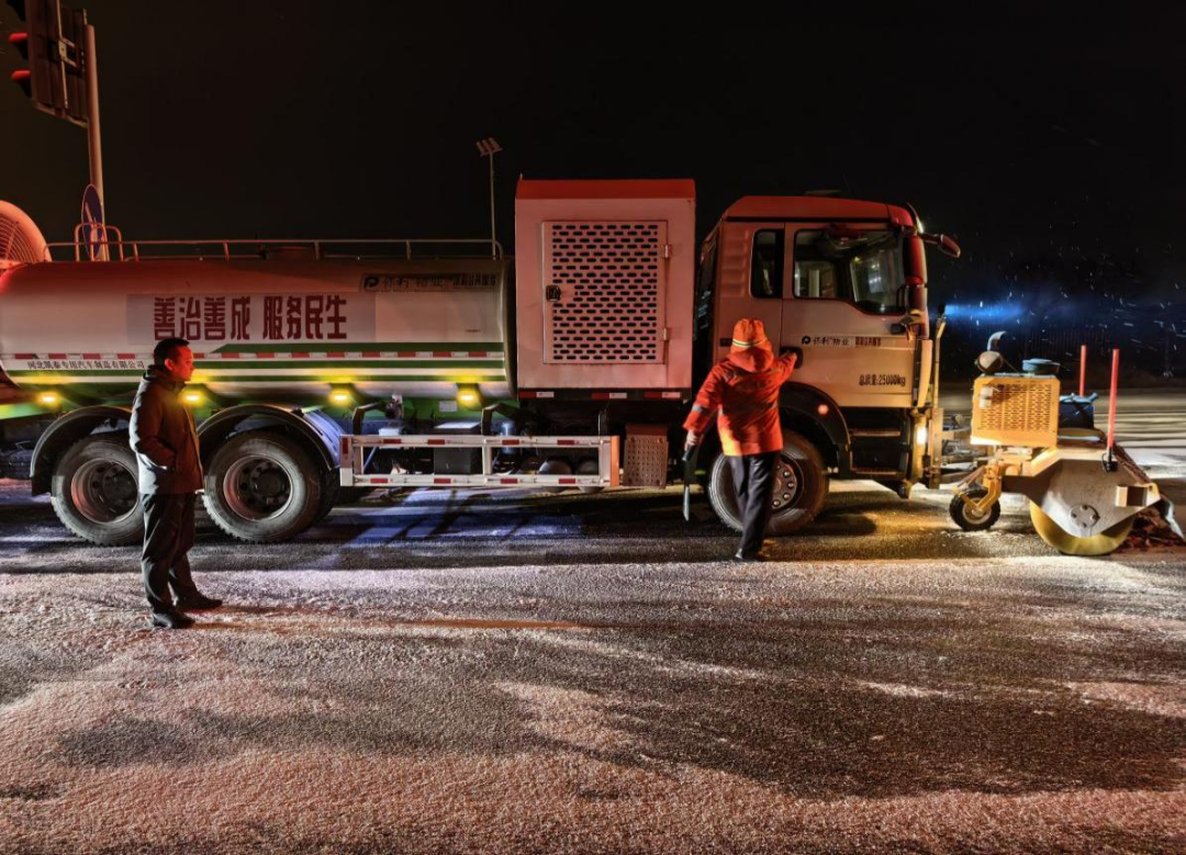 在這場(chǎng)“突擊戰(zhàn)”中,公司堅(jiān)持“機(jī)械為主、人工為輔、科學(xué)作業(yè)”的策略,滾刷車、撒布機(jī)、推雪鏟等專業(yè)設(shè)備組成編隊(duì),集中優(yōu)勢(shì)兵力優(yōu)先攻堅(jiān)南中環(huán)高架、跨河大橋及其匝道、醫(yī)院學(xué)校周邊等關(guān)鍵咽喉路段。通過(guò)“機(jī)械滾刷清理+融雪劑科學(xué)撒布”的工藝組合與循環(huán)作業(yè),全力防止道路結(jié)冰。專業(yè)隊(duì)伍的精準(zhǔn)攻堅(jiān)與社會(huì)力量的暖心補(bǔ)充相結(jié)合,確保了全區(qū)交通動(dòng)脈在最短時(shí)間內(nèi)恢復(fù)暢行。
