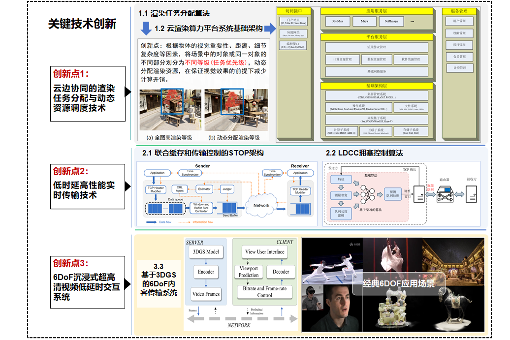 該項目提出了云邊協(xié)同的細粒度分布式云渲染任務(wù)分配方法和資源調(diào)度技術(shù),研發(fā)的渲染平臺,支持實時渲染及離線渲染功能,可分幀、分節(jié)點進行分布式、分等級渲染。同時,提出了低時延共性能實時傳輸技術(shù)和研發(fā)了虛擬直播應(yīng)用系統(tǒng),對比現(xiàn)有SOTA方案,渲染與傳輸時延明顯下降。項目還提出了基于3D高斯的6DoF沉浸式內(nèi)容生成、交互與傳輸系統(tǒng),包括動態(tài)幀率與編碼、視口預(yù)測與糾正機制、云邊協(xié)同的低時延交互等技術(shù),提升QoE,可支持手機、平板和電腦等終端。