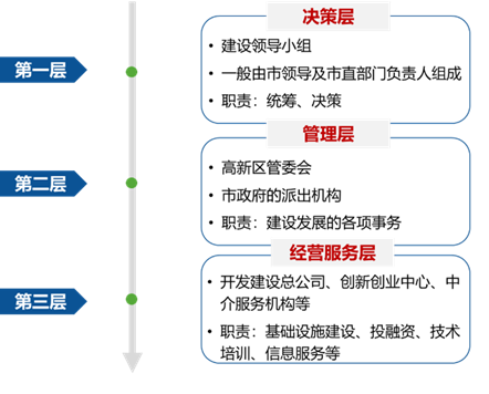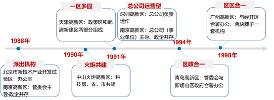 1988年,國(guó)務(wù)院批準(zhǔn)實(shí)施火炬計(jì)劃,明確把創(chuàng)辦高新區(qū)作為火炬計(jì)劃的重要內(nèi)容;同年,批準(zhǔn)建立第一個(gè)國(guó)家高新區(qū)——北京市新技術(shù)產(chǎn)業(yè)開(kāi)發(fā)試驗(yàn)區(qū)(以下簡(jiǎn)稱(chēng)“北京試驗(yàn)區(qū)”),也就是中關(guān)村科技園區(qū)的前身,批準(zhǔn)頒布《北京市新技術(shù)產(chǎn)業(yè)開(kāi)發(fā)試驗(yàn)區(qū)暫行條例》,拉開(kāi)了我國(guó)建設(shè)國(guó)家高新區(qū)的序幕。北京市政府根據(jù)該《暫行條例》發(fā)布實(shí)施細(xì)則,明確規(guī)定北京市試驗(yàn)區(qū)辦公室是海淀區(qū)人民政府的派出機(jī)構(gòu) ,在海淀區(qū)人民政府領(lǐng)導(dǎo)和市科委指導(dǎo)監(jiān)督下,具體辦理新技術(shù)企業(yè)的審批核定事宜。同年7月,為加強(qiáng)對(duì)北京試驗(yàn)區(qū)的領(lǐng)導(dǎo)和協(xié)調(diào)工作,北京市政府牽頭組建了北京試驗(yàn)區(qū)協(xié)調(diào)委員會(huì) ,由北京市副市長(zhǎng)任委員會(huì)主任,北京試驗(yàn)區(qū)辦公室兼協(xié)調(diào)委員會(huì)辦公室職能。北京試驗(yàn)區(qū)的建設(shè)模式為后來(lái)國(guó)家高新區(qū)組建領(lǐng)導(dǎo)小組,成立作為政府派出機(jī)構(gòu)的管委會(huì)奠定了重要基礎(chǔ)。在中關(guān)村科技園區(qū)成功探索的基礎(chǔ)上,1991年和1992年,國(guó)務(wù)院先后批準(zhǔn)建立了51家國(guó)家高新區(qū),全面啟動(dòng)國(guó)家高新區(qū)建設(shè)。為貫徹落實(shí)黨中央、國(guó)務(wù)院的指示精神,1991年,原國(guó)家科委和國(guó)家體改委研究制定了《關(guān)于深化高新技術(shù)產(chǎn)業(yè)開(kāi)發(fā)區(qū)改革,推進(jìn)高新技術(shù)產(chǎn)業(yè)發(fā)展的決定》,進(jìn)一步明確了國(guó)家高新區(qū)改革的基本方向、原則和思路,明確國(guó)家高新區(qū)要根據(jù)發(fā)展社會(huì)主義有計(jì)劃商品經(jīng)濟(jì)的要求,建立起符合商品經(jīng)濟(jì)運(yùn)行規(guī)律,適應(yīng)高新技術(shù)產(chǎn)業(yè)發(fā)展要求和國(guó)際慣例的體制、機(jī)制;各開(kāi)發(fā)區(qū)要因地制宜地建立決策、管理機(jī)構(gòu),賦予相應(yīng)的權(quán)限,代表當(dāng)?shù)卣惺剐姓殭?quán), 統(tǒng)一對(duì)內(nèi)對(duì)外,集中有效地協(xié)調(diào)解決開(kāi)發(fā)區(qū)發(fā)展中的重大問(wèn)題,并在工商、稅務(wù)、財(cái)政、金融、國(guó)際合作交流、外貿(mào)、進(jìn)出口等方面形成配套、高效的服務(wù)功能,為企業(yè)提供綜合服務(wù)。在1988年到2000年的“一次創(chuàng)業(yè)”階段,國(guó)家高新區(qū)發(fā)展到53家,成為我國(guó)高新技術(shù)的集聚地和成果轉(zhuǎn)化、產(chǎn)業(yè)發(fā)展的增長(zhǎng)極。由于這一階段高新技術(shù)產(chǎn)業(yè)發(fā)展基礎(chǔ)總體薄弱,需要強(qiáng)有力的管理機(jī)構(gòu)創(chuàng)造發(fā)展環(huán)境,同時(shí)借鑒了當(dāng)時(shí)國(guó)家經(jīng)開(kāi)區(qū)的管理經(jīng)驗(yàn),大多高新區(qū)采取較封閉的管理模式,探索集中授權(quán)管理。 初步形成了具有中國(guó)特色的“領(lǐng)導(dǎo)小組+管委會(huì)+公司” 管理架構(gòu),實(shí)行“決策層-管理層-服務(wù)層” 開(kāi)放式管理模式。其中,“決策層”即由市政府主要負(fù)責(zé)人及市政府有關(guān)行政管理部門(mén)負(fù)責(zé)人組成的領(lǐng)導(dǎo)小組,為強(qiáng)化政府的作用,一般由市級(jí)主要領(lǐng)導(dǎo)擔(dān)任領(lǐng)導(dǎo)小組組長(zhǎng)。主要負(fù)責(zé)宏觀決策、重大政策制定、用地規(guī)劃、協(xié)調(diào)解決高新區(qū)開(kāi)發(fā)建設(shè)及管理過(guò)程中的重大問(wèn)題等?!肮芾韺印奔醋鳛檎沙鰴C(jī)構(gòu)的管委會(huì),代表當(dāng)?shù)卣惺拐殭?quán),對(duì)園區(qū)實(shí)行統(tǒng)一領(lǐng)導(dǎo),負(fù)責(zé)具體發(fā)展規(guī)劃、建設(shè)和管理等職責(zé)?!胺?wù)層”即設(shè)立園區(qū)開(kāi)發(fā)建設(shè)公司、創(chuàng)新創(chuàng)業(yè)中心等,負(fù)責(zé)園區(qū)基礎(chǔ)設(shè)施建設(shè)、投融資、創(chuàng)業(yè)孵化等功能。實(shí)踐中,各國(guó)家高新區(qū)也結(jié)合自身實(shí)際情況,逐步探索適宜區(qū)域特征、順應(yīng)市場(chǎng)經(jīng)濟(jì)發(fā)展的多樣化管理體制 。如南京高新區(qū)創(chuàng)建初期采取以管委會(huì)為主導(dǎo)的政企并存模式;海南高新區(qū)、深圳高新區(qū)采取以企業(yè)、總公司為主導(dǎo)的管理體制;桂林高新區(qū)由具有一定行政職能的事業(yè)單位來(lái)實(shí)行企業(yè)管理;中山、廈門(mén)和威海三個(gè)國(guó)家高新區(qū),由原國(guó)家科委、省科委和當(dāng)?shù)卣限k,被命名為火炬高新區(qū),在行政管理的基礎(chǔ)上,成立開(kāi)發(fā)總公司,負(fù)責(zé)高新區(qū)基礎(chǔ)設(shè)施建設(shè)、新技術(shù)產(chǎn)業(yè)投資和部分公共事務(wù)管理。