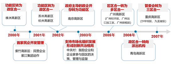 二、“二次創(chuàng)業(yè)”階段:深化“精簡(jiǎn)、高效”改革,積極探索經(jīng)濟(jì)與社會(huì)統(tǒng)籌管理機(jī)制 進(jìn)入21世紀(jì),國(guó)內(nèi)外經(jīng)濟(jì)形勢(shì)發(fā)生巨大變化,中國(guó)加入WTO,科技創(chuàng)新成為我國(guó)發(fā)展主旋律。2001年,科技部在總結(jié)前一階段國(guó)家高新區(qū)建設(shè)經(jīng)驗(yàn)的基礎(chǔ)上,研究提出了國(guó)家高新區(qū)“二次創(chuàng)業(yè)”的新任務(wù)和新目標(biāo),核心是要推進(jìn)“五個(gè)轉(zhuǎn)變”, 從第一階段的外延式發(fā)展向更加依靠科技創(chuàng)新的內(nèi)涵式發(fā)展階段轉(zhuǎn)變,更加注重“創(chuàng)新驅(qū)動(dòng)、內(nèi)生增長(zhǎng)” 。2002年,科技部印發(fā)《關(guān)于國(guó)家高新區(qū)管理體制改革與創(chuàng)新的若干意見(jiàn)》,指出國(guó)家高新區(qū)要建立適應(yīng)社會(huì)主義市場(chǎng)經(jīng)濟(jì)要求和高新技術(shù)產(chǎn)業(yè)發(fā)展規(guī)律、符合WTO規(guī)則的管理體制和運(yùn)行機(jī)制,國(guó)家高新區(qū)管理機(jī)構(gòu)要按照“精簡(jiǎn)、高效、優(yōu)質(zhì)”的原則不斷推進(jìn)職能轉(zhuǎn)變 ,進(jìn)一步提高管理效率和靈活度?!岸蝿?chuàng)業(yè)”期間,國(guó)家高新區(qū)普遍加強(qiáng)了內(nèi)涵式和外延式相結(jié)合、引進(jìn)大企業(yè)和培育小企業(yè)相結(jié)合的發(fā)展力度,不僅大力引進(jìn)國(guó)內(nèi)外研發(fā)機(jī)構(gòu)、科教資源和龍頭企業(yè)進(jìn)駐,而且著力營(yíng)造創(chuàng)新創(chuàng)業(yè)氛圍,建設(shè)不同類(lèi)型的科技企業(yè)孵化器,運(yùn)用各種政策手段和市場(chǎng)力量,推動(dòng)內(nèi)生發(fā)展動(dòng)力的增長(zhǎng),形成了研發(fā)機(jī)構(gòu)密集、大企業(yè)和小企業(yè)和諧共生的產(chǎn)業(yè)鏈條。同時(shí),國(guó)家高新區(qū)也不再是單純的產(chǎn)業(yè)園區(qū),而是形成了產(chǎn)城融合的具有現(xiàn)代化形象的科技新城和城市新地標(biāo), 不僅增強(qiáng)了創(chuàng)新活力和發(fā)展實(shí)力,而且提高了示范、輻射、引領(lǐng)和帶動(dòng)作用,成為宜居宜業(yè)的創(chuàng)新創(chuàng)業(yè)高地,相應(yīng)也帶來(lái)諸多社會(huì)事務(wù)管理方面的新挑戰(zhàn) 。經(jīng)過(guò)十余年的發(fā)展,特別是產(chǎn)業(yè)規(guī)模的迅速擴(kuò)大,部分國(guó)家高新區(qū)面臨空間緊缺的瓶頸,于是采用了不同方式,擴(kuò)大管理范圍,拓展發(fā)展空間 。同時(shí),現(xiàn)實(shí)中的不完全政府模式、不明晰職能邊界導(dǎo)致的矛盾日益凸顯,管理體制機(jī)制不順成為制約國(guó)家高新區(qū)創(chuàng)新發(fā)展重要因素。為此,國(guó)家高新區(qū)先后開(kāi)啟了不同類(lèi)型、不同程度的新一輪管理體制改革 。如株洲、青島、桂林、蘇州等高新區(qū)為解決空間不足、社會(huì)事務(wù)難以協(xié)調(diào)等問(wèn)題,將高新區(qū)與行政區(qū)合并或建立新區(qū);上海紫竹采用多元化的股權(quán)結(jié)構(gòu),形成民營(yíng)企業(yè)、高等院校、市區(qū)鎮(zhèn)政府“三結(jié)合”運(yùn)營(yíng)模式,成為全國(guó)首家以民營(yíng)企業(yè)為開(kāi)發(fā)主體的開(kāi)發(fā)區(qū);廣州高新區(qū)進(jìn)一步與新組建的蘿崗區(qū)合并,重慶高新區(qū)與沙坪壩區(qū)、九龍坡區(qū)等的鄉(xiāng)鎮(zhèn)街道合并實(shí)現(xiàn)擴(kuò)容升級(jí),等等;形成包括區(qū)區(qū)合一、政區(qū)合一和多區(qū)合一模式。