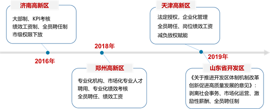 三、“創(chuàng)新驅(qū)動(dòng)戰(zhàn)略提升”階段: 加快轉(zhuǎn)變政府職能,著力推進(jìn)市場(chǎng)化改革 黨的十八大以來(lái),改革進(jìn)入了深水區(qū),開(kāi)放邁向了新階段,創(chuàng)新驅(qū)動(dòng)發(fā)展成為國(guó)家戰(zhàn)略,國(guó)家高新區(qū)進(jìn)入“創(chuàng)新驅(qū)動(dòng)、戰(zhàn)略提升”階段 。黨中央、國(guó)務(wù)院高度重視轉(zhuǎn)變政府職能,把“放管服”改革作為全面深化改革的重要內(nèi)容,持續(xù)推進(jìn)簡(jiǎn)政放權(quán),實(shí)行放管結(jié)合,優(yōu)化行政服務(wù),以市場(chǎng)在資源配置中起決定性作用和更好發(fā)揮政府作用為目標(biāo),著力破解制約科技創(chuàng)新活力的體制機(jī)制障礙。2013年,科技部出臺(tái)《國(guó)家高新區(qū)戰(zhàn)略提升行動(dòng)方案》,提出國(guó)家高新區(qū)要積極建設(shè)服務(wù)型政府,形成國(guó)家、地方、社會(huì)等各方力量聯(lián)合治理新模式。2017年2月,國(guó)務(wù)院辦公廳出臺(tái)《關(guān)于促進(jìn)開(kāi)發(fā)區(qū)改革和創(chuàng)新發(fā)展的若干意見(jiàn)》(國(guó)辦發(fā)[2017]7號(hào)),提出開(kāi)發(fā)區(qū)要將政企分開(kāi)、政資分開(kāi),行政剝離、市場(chǎng)化運(yùn)作作為下一步改革的重點(diǎn)方向。2020年7月,國(guó)務(wù)院出臺(tái)《關(guān)于促進(jìn)國(guó)家高新技術(shù)產(chǎn)業(yè)開(kāi)發(fā)區(qū)高質(zhì)量發(fā)展的若干意見(jiàn)》(國(guó)發(fā)〔2020〕7號(hào)),對(duì)國(guó)家高新區(qū)深化管理體制機(jī)制改革作出頂層設(shè)計(jì) ,要求國(guó)家高新優(yōu)化內(nèi)部管理架構(gòu),實(shí)行扁平化管理,探索崗位管理制度,實(shí)行聘用制,建立完善符合實(shí)際的分配激勵(lì)和考核機(jī)制,并賦予國(guó)家高新區(qū)相應(yīng)的省級(jí)和市級(jí)經(jīng)濟(jì)管理權(quán)限。綜合來(lái)看,我國(guó)正處于轉(zhuǎn)變發(fā)展方式、優(yōu)化經(jīng)濟(jì)結(jié)構(gòu)、轉(zhuǎn)換增長(zhǎng)動(dòng)力的攻關(guān)期,國(guó)家高新區(qū)過(guò)去依賴(lài)政策紅利、政府主導(dǎo)色彩濃厚等長(zhǎng)期積累的問(wèn)題逐漸顯露,面臨著要素成本制約、政策優(yōu)勢(shì)減弱、區(qū)域內(nèi)外競(jìng)爭(zhēng)壓力增大、發(fā)展活力不足、發(fā)展動(dòng)能減弱等困境,因此積極轉(zhuǎn)變政府職能、引入市場(chǎng)化效率機(jī)制勢(shì)在必行。圍繞“放管服”深化改革,一批國(guó)家高新區(qū)開(kāi)始積極探索符合新時(shí)代要求的行政審批、組織機(jī)構(gòu)、人事管理、薪酬激勵(lì)新機(jī)制,著力構(gòu)建精簡(jiǎn)高效的管理服務(wù)體系 。如2016年濟(jì)南高新區(qū)堅(jiān)持問(wèn)題導(dǎo)向,圍繞“企業(yè)化管理、市場(chǎng)化運(yùn)作、專(zhuān)業(yè)化服務(wù)”目標(biāo),推行機(jī)構(gòu)大部制、實(shí)行全員聘任制、改革干部考評(píng)體系、采用績(jī)效工資制、深化簡(jiǎn)政放權(quán),激發(fā)高新區(qū)發(fā)展創(chuàng)造力。2019年天津?yàn)I海高新區(qū)依據(jù)自身為功能區(qū)的本質(zhì),推行法定機(jī)構(gòu)改革,目標(biāo)是去除行政事業(yè)身份,全面引入市場(chǎng)化經(jīng)營(yíng)理念和企業(yè)化激勵(lì)機(jī)制。2020年,玉溪高新區(qū)、蘭州高新區(qū)等圍繞強(qiáng)化經(jīng)濟(jì)發(fā)展和創(chuàng)新促進(jìn)功能,探索開(kāi)展全員聘任制、績(jī)效考核制、薪酬激勵(lì)制等改革,以進(jìn)一步激發(fā)廣大干部的干事創(chuàng)業(yè)熱情。