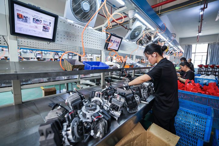 2024年8月14日,在浙江省金華市金東區(qū)曹宅鎮(zhèn)的浙江托馬斯工具制造有限公司數(shù)字化車間內(nèi),工人在流水線上生產(chǎn)出口的園林機(jī)械。近年來,金華市金東區(qū)大力推動(dòng)數(shù)字化改造,聚焦智能家居、電動(dòng)(園林)工具等主導(dǎo)行業(yè),以場景應(yīng)用帶動(dòng)“智改數(shù)轉(zhuǎn)網(wǎng)聯(lián)”項(xiàng)目建設(shè)。新華社記者 徐昱 攝
