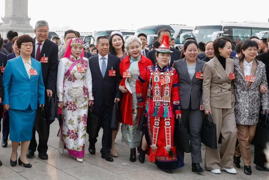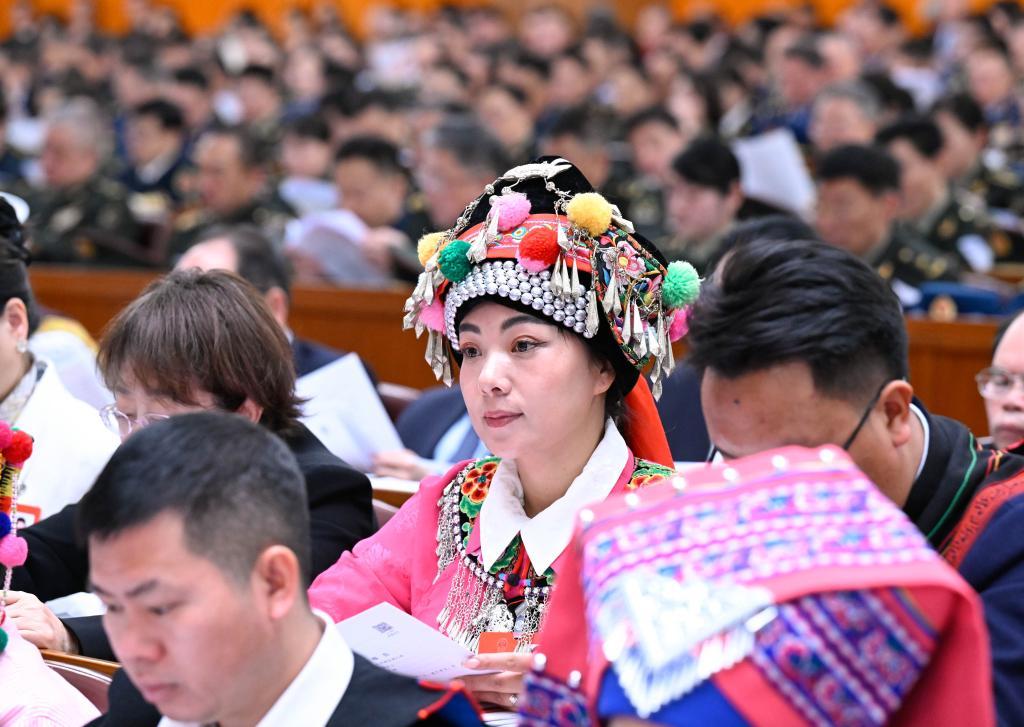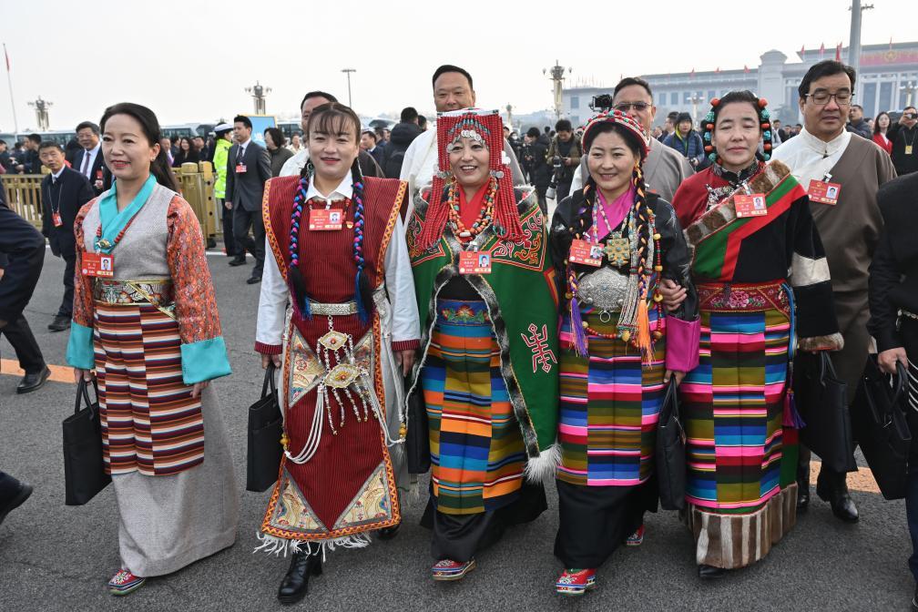 3月5日,全國人大代表格西王姆(左二)在十四屆全國人大三次會(huì)議開幕會(huì)上聽會(huì)。