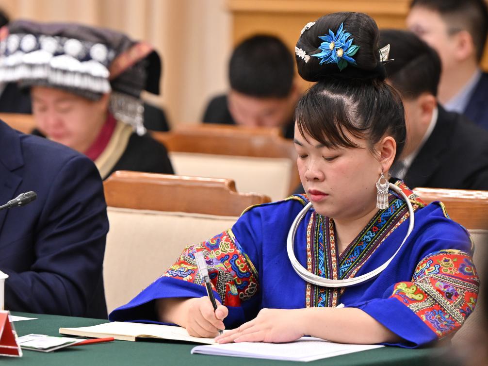3月6日,全國人大代表在十四屆全國人大三次會(huì)議貴州代表團(tuán)開放團(tuán)組會(huì)議上聽會(huì)。