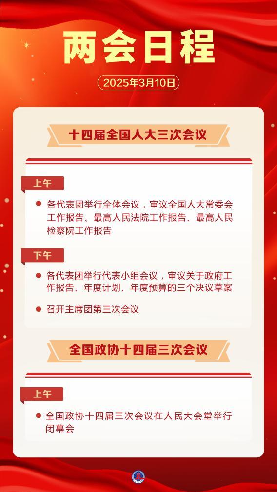 新華社北京3月9日電 十四屆全國人大三次會議各代表團10日上午舉行全體會議,審議全國人大常委會工作報告、最高人民法院工作報告、最高人民檢察院工作報告。下午,各代表團舉行代表小組會議,審議關(guān)于政府工作報告、年度計劃、年度預(yù)算的三個決議草案;召開主席團第三次會議。
