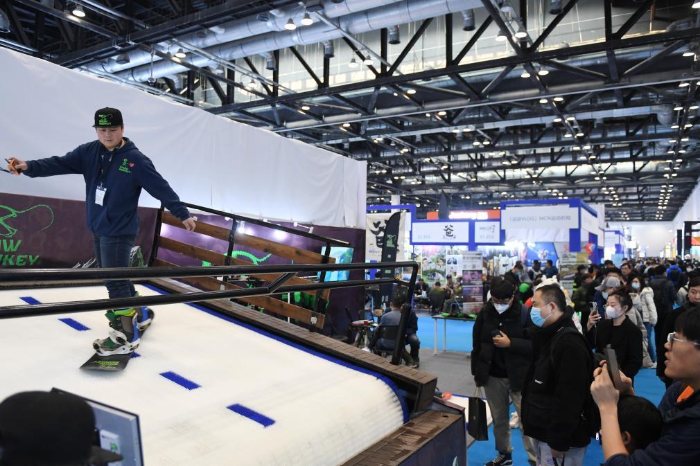 2023年2月11日,參觀者在展會(huì)上了解一款模擬滑雪設(shè)備。當(dāng)日,2023亞洲運(yùn)動(dòng)用品與時(shí)尚展在國(guó)家會(huì)議中心拉開(kāi)帷幕。新華社記者 張晨霖 攝