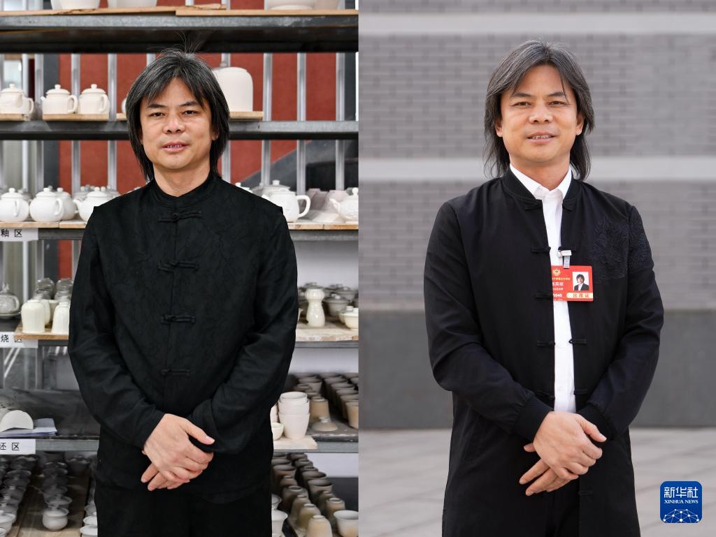 拼版照片:左圖為在河北省曲陽縣拍攝的全國政協(xié)委員、河北翰鼎雕塑集團(tuán)首席技師高英坡(新華社記者牟宇2025年2月21日攝);右圖為在北京的駐地拍攝的高英坡(新華社記者周荻瀟2025年3月6日攝)。