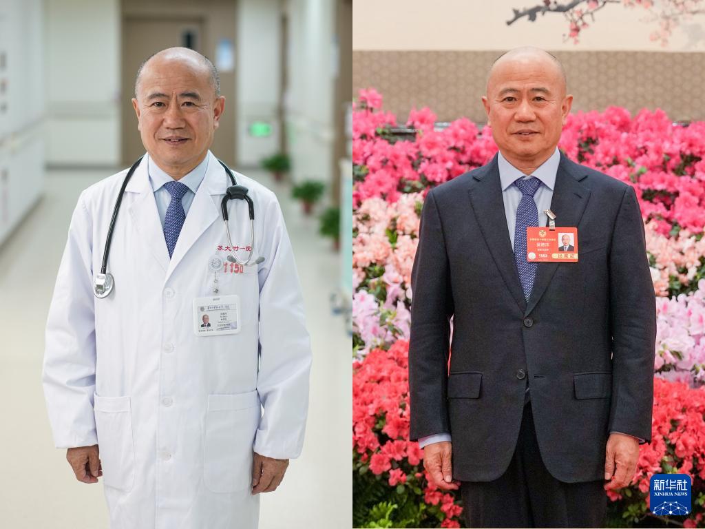 拼版照片:左圖為在蘇州大學(xué)附屬第一醫(yī)院拍攝的全國政協(xié)委員、蘇州大學(xué)附屬第一醫(yī)院血液科主任吳德沛(新華社記者季春鵬2025年2月17日攝);右圖為在北京人民大會堂拍攝的吳德沛(新華社記者周荻瀟2025年3月4日攝)。