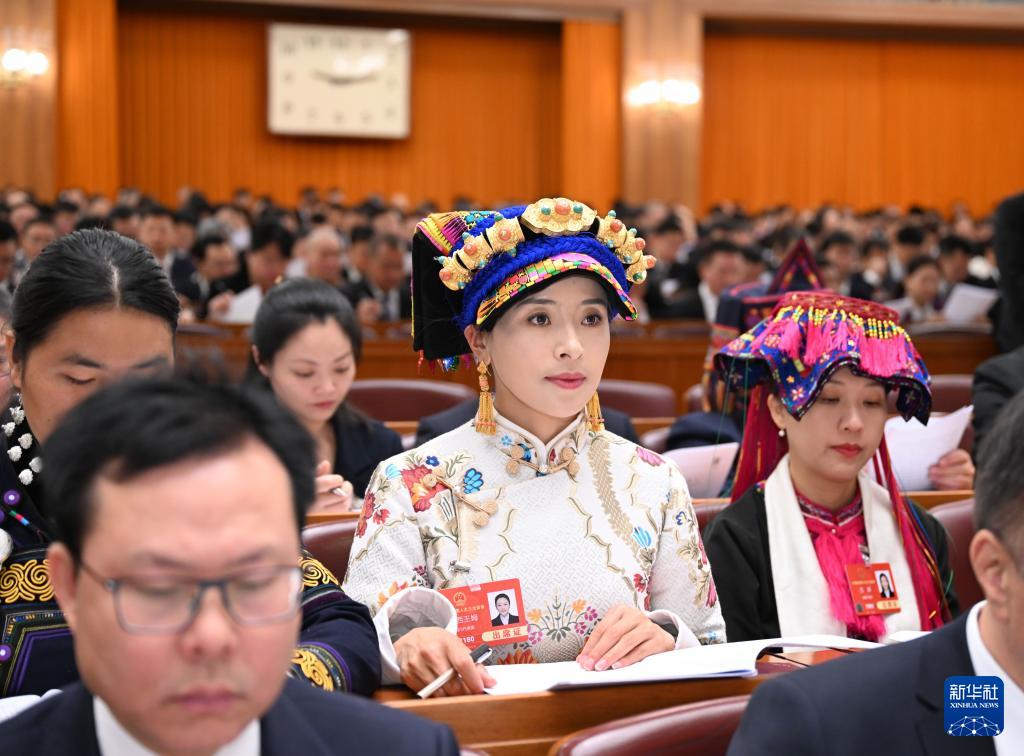 3月5日,全國人大代表、云南省南澗彝族自治縣民族文化工作隊隊員魯麗華在北京人民大會堂出席十四屆全國人大三次會議開幕會。