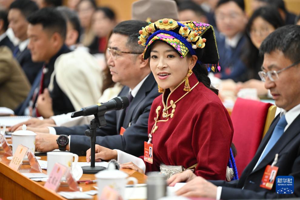 3月5日,全國人大代表、四川省阿壩藏族羌族自治州馬爾康市老年養(yǎng)護(hù)院院長格西王姆在北京人民大會堂出席十四屆全國人大三次會議開幕會。