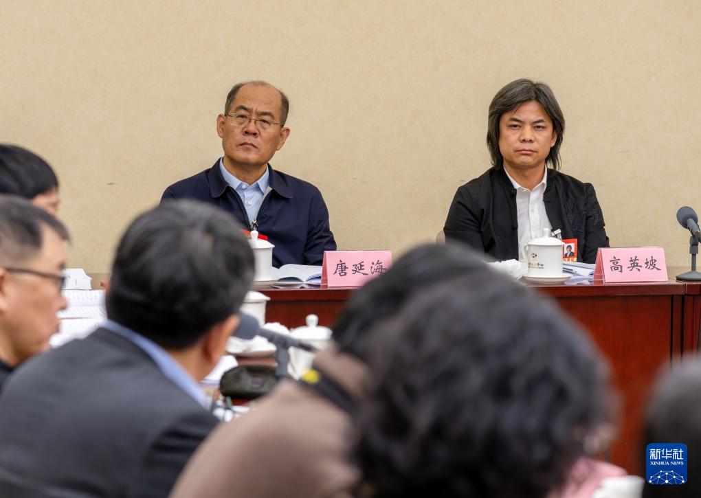 3月6日,全國政協(xié)委員、河北翰鼎雕塑集團(tuán)首席技師高英坡(右一)在北京的駐地參加文化藝術(shù)界小組討論。