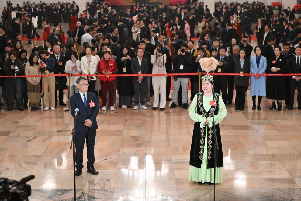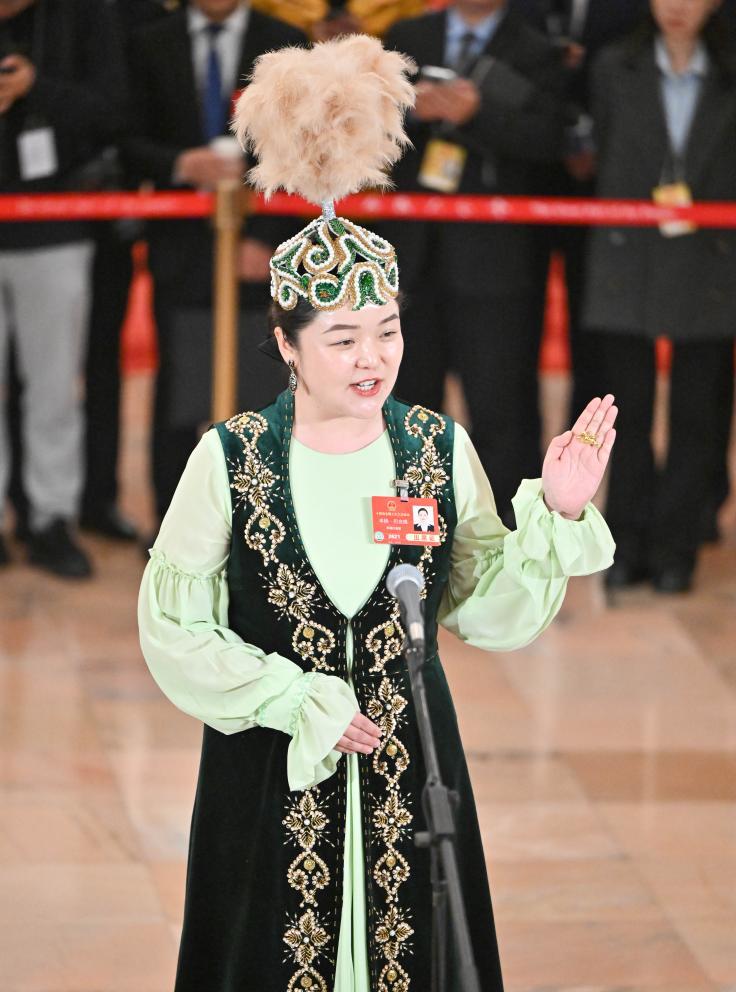3月11日,第十四屆全國(guó)人民代表大會(huì)第三次會(huì)議第三場(chǎng)“代表通道”集中采訪活動(dòng)在北京人民大會(huì)堂舉行。這是全國(guó)人大代表卓婭·巴合提接受媒體采訪。
