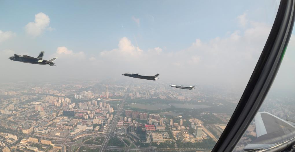 9月3日,紀(jì)念中國人民抗日戰(zhàn)爭(zhēng)暨世界反法西斯戰(zhàn)爭(zhēng)勝利80周年大會(huì)在北京隆重舉行。這是殲擊機(jī)梯隊(duì)從北京城區(qū)上空飛過。新華社記者 白雪騏 攝