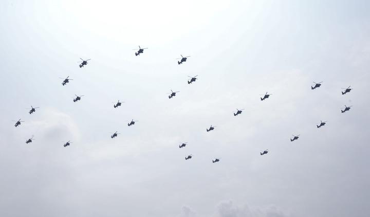 9月3日,紀(jì)念中國人民抗日戰(zhàn)爭暨世界反法西斯戰(zhàn)爭勝利80周年大會(huì)在北京隆重舉行。這是空中護(hù)旗梯隊(duì)通過天安門廣場,26架直-19武裝直升機(jī)組成“80”字樣。新華社記者 陳曄華 攝